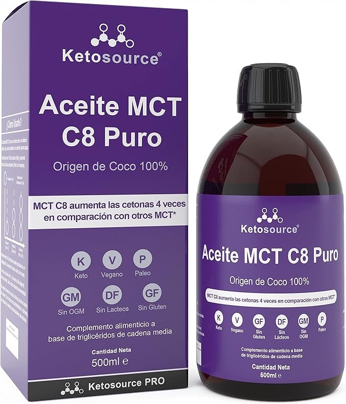 Aceite MCT: Aumenta los niveles de energía al dar al cuerpo una fuente de combustible cetona natural. Esto es energía limpia. No aumenta la glucosa en la sangre y tiene una respuesta mucho más baja a la insulina que otros combustibles (glucosa, azúcar, proteína, etc.) e incluso alimentos similares (por ejemplo, aceite de coco, otros aceites MCT con C10 y C12 MCT). Por último, la energía cetona mantiene sus niveles de energía porque dura más tiempo que la glucosa.